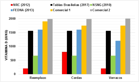 Las recomendaciones de vitamina D para cerdos en etapareproductiva se muestran en la Tabla 4 y se grafican en la Figura 3 para mejor comprensión. Los valores más bajos son los sugeridos por el NRC en cerdas de reemplazo (nulíparaso futuras madres) y verracos (machos sexualmente activos) siendo de 200 UI/Kg para ambos casos, mientras que para el caso de cerdas los valores más bajos los presenta NSNG 660 UI/Kg. Los niveles más altos en todas las categorías reproductivas están dado por Comercial 2 1985, 1985 y 2000 UI/Kg para reemplazo, cerdas y verracos, respectivamente; resultando ser 10 veces superior a las recomendaciones del NRC y coincidiendo en ser el nivel más alto por parte de esta guía al igual que en cerdos de engorde. Seguido a los valores de Comercial 2 se encuentran los de Comercial 1, 1900, 1750 y 1750 UI/Kg de alimento. Valores intermedios en la comparación general y muy similares entre sí son los descritos por las tablas brasileñas y FEDNA con un rango entre 1200 - 1600 UI/Kg; siendo 8 veces superior a las recomendaciones del NRC para reemplazo y verracos y el doble en la categoría decerdas.