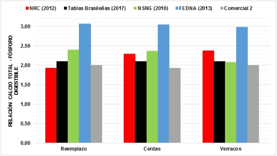 Las relaciones calcio total−fósforo digestible se observan en la Figura 4. Los valores más altos son los calculados para FEDNA siendo de 3,06,3,05 y 2,98 en reemplazo, cerdas y verracos, respectivamente. Las demás guías nutricionales (NRC, Tablas brasileñas, NSNG, Comercial 2) presentan valores similares que oscilan entre 1,93-2,39; 1,93-2,36 y 2- 2,37 para reemplazo, cerdas y verracos respectivamente. No se presentan los valores de Comercial 1 pues esta guía únicamente presenta recomendaciones de vitaminas.