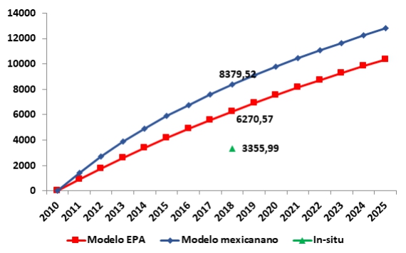 En el modelo de la EPA, la estimación de la generación de biogás (LFG) producida se multiplica por la eficiencia de recolección para estimar el volumen de final de metano que se puede recuperar. Sin embargo, las proyecciones se calculan con base en estimaciones de eficiencia de captura razonables para rellenos sanitarios que cumplen con los estándares establecidos en Titulo 40, parte 258 del Código de Regulaciones Federales en los Estados Unidos de América. Las eficiencias de recolección que reportan estos rellenos sanitarios oscilan entre el 50% y el 95% de eficiencia, por lo que el modelo asume un 75% de eficiencia de captura. Adicionalmente,el modelo de la EPA asume instalaciones con un sistema integral de recolección y tratamiento que aumentará su eficiencia y los años proyectados. En consecuencia, la variación del valor real in situ con las estimaciones del modelo EPA es entendible ya que los rellenos sanitarios en México carecen de sistemas integrales que garanticen una eficiencia en la captura de biogás, y sobre todo que los rellenos sanitarios en México en su gran mayoría basan su operación en métodos rudimentarios y tecnologías obsoletas (Escamilla y col., 2016).