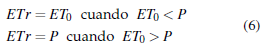 Donde P eslaprecipitación, ET eslaevapotranspiración, Q es el flujo superficial y ∆S es la variación de almacenamiento, con todos los términos medidos en unidades de mm. El término de evapotranspiración, ET , en (5) se cuantifica en comparación con ET0 a P de tal forma que la evapotranspiración real (ETr) se cuantifica como: