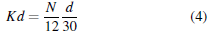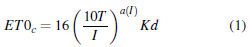 Donde ET 0c es la evapotranspiración potencial corregida, T es la temperatura media del aire en el período considerado [°C], I es el índice térmico anual, y Kd es el coeficiente de duración del sol y número de días del mes. El índice térmico anual (I) se define como: