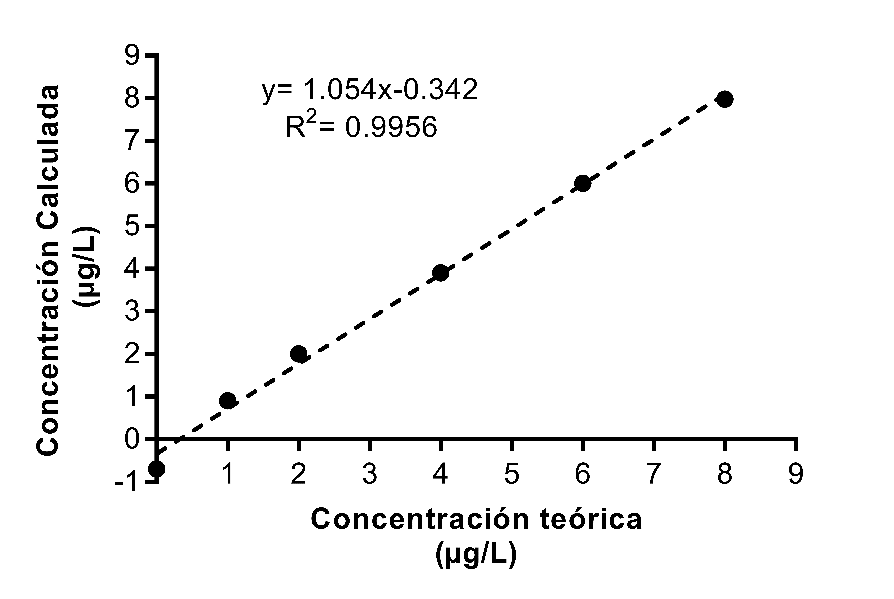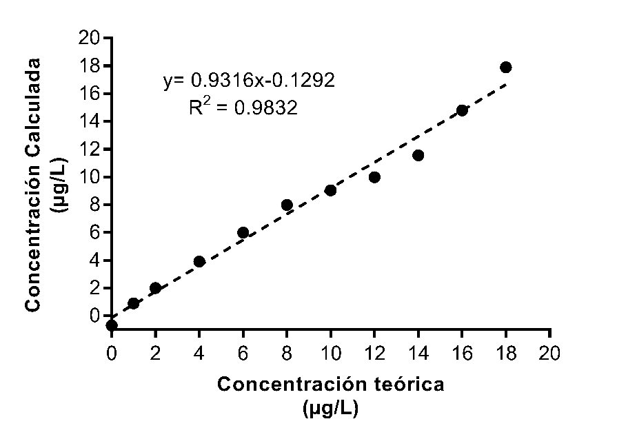 En la Figura 1, se graficó la concentración teórica(0-18 ppb) frente a la proporcionada por el equipo(calculada) y, se procedió a realizar un análisis visualen el que se estableció que el rango lineal seencuentra entre 0 y 8 ppb (Figura 2 y 3). Se observaque el rango lineal se encuentra entre 0 y 8 ppb (Figura 2), con un coeficiente de residualidad de0,9956, aceptable para procedimientos analíticos.
