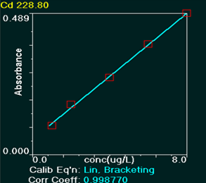 Se elaboró una curva con 10 concentraciones a partir del estándar de Cd de 20 ppb. Las concentraciones utilizadas fueron de 0 a 18 ppb. En la curva se expresó en el eje de las “x” la concentración teórica en µg/L y en el eje de las “y” la concentración calculada en µg/L. A partir de la curva resultante se escogió el rango lineal y se elaboró una nueva curva. En este intervalo lineal se midió por triplicado un blanco, seis diluciones diferentes del estándar de 20 ppb y finalmente los MRC 07206B y 07167A.