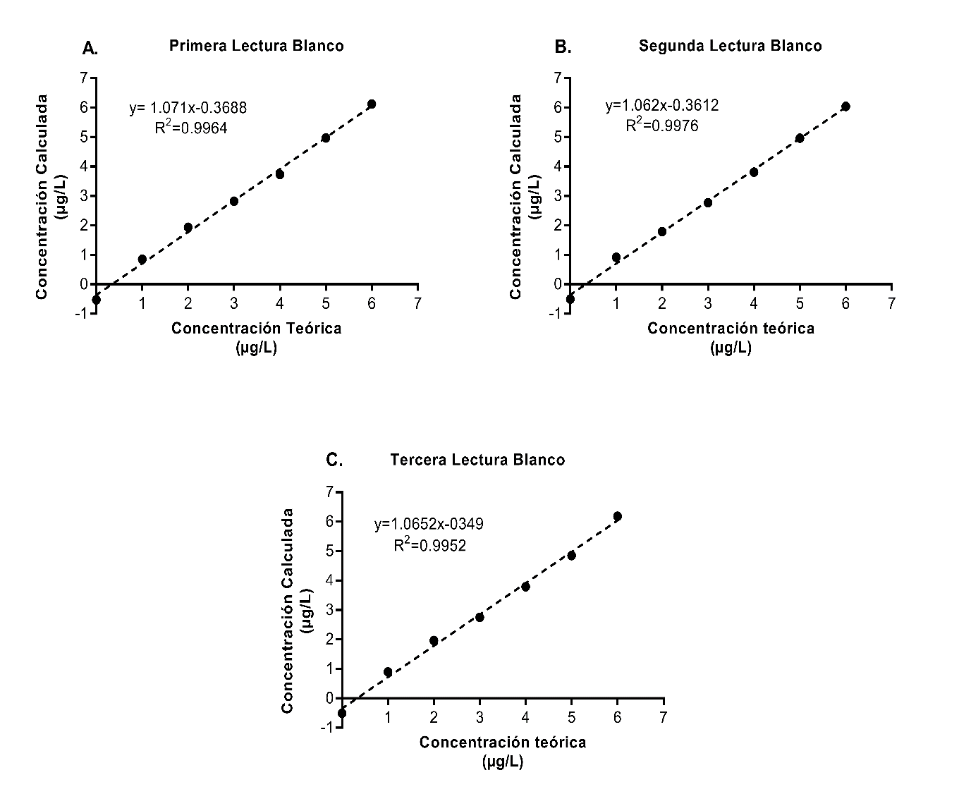 El método GFAAS arrojó una curva de calibración (Figura 3), que presentó un coeficiente de residualidad de 0.998770, mucho más exacta que la calculada, en razón que esta utiliza sólo los puntos de interés, eliminado errores de fondo. Para confirmar la linealidad del método y siguiendo el procedimiento de la Guía Eurachem (2016) se midió un blanco y seis disoluciones de concentraciones conocidas en el rango lineal dado por el equipo, que está representado en la Figura 4. En la Figura 4A. se observa que el coeficiente de residualidad fue de 0.9964; Figura 4B. 0.9976 y Figura 4C. 0.9952, que confirman la linealidad del método.