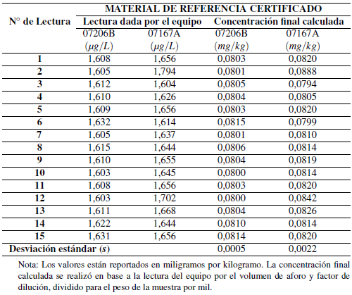 Se realizaron diez lecturas para MRC 07206B, diez lecturas para tres blancos digestados y diez lecturas para tres blancos adicionados con 2, 3 y 4 ppb de Cd. Además; también se realizaron diez lecturas sobre tres muestras analizadas, en primera instancia, por el método que normalmente usaba el laboratorio, en el que se emplea una digestión ácida con Agua Regia (HCl:HNO3), seguida de una lectura mediante espectroscopía de absorción atómica (AA) de llama y, en segunda instancia, por el método GFAAS verificado y el protocolo de análisis propuesto en esta investigación.