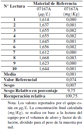 En la medición de la veracidad se realizaron diez lecturas del material de referencia certificado 07167A; en base a los datos obtenidos se calculó la media, el sesgo, sesgo relativo en porcentaje y la recuperación relativa, usando como valor referencial el dato proporcionado por el certificado del material de referencia, como se observa en la Tabla 2.