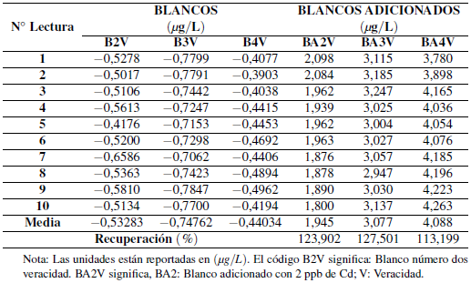 Adicionalmente se realizaron diez lecturas de tres blancos y diez lecturas de los mismos blancos adicionados con 2, 3 y 4 ppb de Cd, con lo que se obtuvo la media y porcentaje de recuperación, como se observa en la Tabla 3.