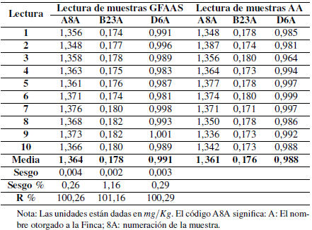 Finalmente se realizaron diez lecturas de tres muestras por el método normalmente usado por el laboratorio (AA), por el método GFAAS verificado y el protocolo propuesto, como se observa en la Tabla 4.