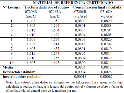 La incertidumbre calculada midiendo la concentración de Cd de los MRC (07206B y 07167A) es de 0,00013 y 0,00082, respectivamente (Tabla 5), lo que indica que las mediciones realizadas no estuvieron afectadas por errores sistemáticos en el proceso.