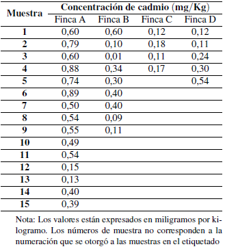 Hipótesis nula: la concentración de Cd en las almendras de cacao de las cuatro fincas no es significativamente diferente.