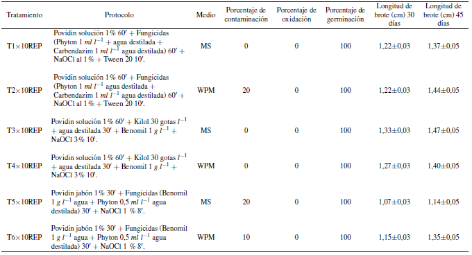 Para la fase de desinfección y establecimiento in vitro de semillas de Buddleja incana el mejor tratamiento fue T3 (Povidin solución 1% 60´ + Kilol 30 gotas l-1 +agua destilada 30` + Benomil 1 g l-1 + NaOCl 3% 10´), con un índice de contaminación de 0 % e índice de supervivencia 100 %. El tratamiento T3 contenía un medio de cultivo MS que resultó efectivo para la variable longitud de brote, ya que los valores más altos fueron de 1,33± 0,03 cm a los 30 días y a los 45 días de 1,47± 0,03 cm. De acuerdo con Jiménez, Castillo, Tavares, Guevara y Montiel (2001), es importante tener en cuenta la zona del tejido que se utiliza para iniciar el cultivo in vitro, ya que ejerce gran influencia en la eficiencia de la desinfección.