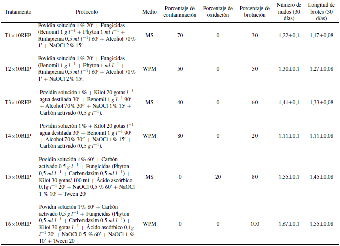 En la fase de establecimiento in vitro de brotes de Buddleja incana el mejor tratamiento fue T6 (Phyton 0,5 ml l-1 + Carbendazim 0,5 ml l-1) + Kilol 30 gotas l-1 + Ácido ascórbico 0,1g l-1 20´ + NaOCl 0.5 % 60´ + NaOCl 1 % 10´ + Tween 20) con 0% de contaminación. El porcentaje de brotación en dicho tratamiento fue del 100 %. El número y longitud de brotes tuvieron una media de 1,67± 0,1 brotes/explante y de 1,55± 0,08 cm de longitud. En el trabajo realizado por Gutiérrez (2002), en la especie Alnus acuminata a partir de segmentos nodales y hoja, se empleó un protocolo de desinfección con concentraciones muy similares de NaClO y tiempos propuestos en el protocolo de Marulanda e Isaza (2004). Los resultados indicaron que el tratamiento de desinfección con NaClO al 1 % produjo menor oxidación en las hojas que en los segmentos nodales.