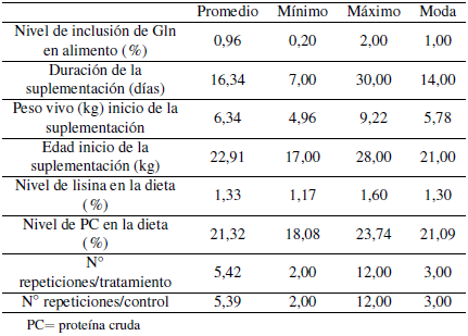 Se seleccionaron aquellos artículos en los cuales se administró glutamina exclusivamente a través de la dieta y en lechones. Los artículos debían incluir información respecto al número de unidades experimentales (repeticiones) por tratamiento; los experimentos debían incluir al menos 2 tratamientos (incluyendo el grupo control: sin Gln), peso vivo y edad del lechón al inicio del periodo de estudio, nivel de glutamina suplementado a través del alimento y duración de la suplementación, nivel de lisina y proteína cruda en el alimento utilizado (covariables). Además, debía incluir al menos una de las variables respuesta de interés: ganancia diaria de peso (GDP), consumo diario promedio de alimento (CDPA) y conversión alimenticia (CA). Debían incluir media (promedio) y alguna medida de variación (desviación estándar (SD), error estándar (SE)).
