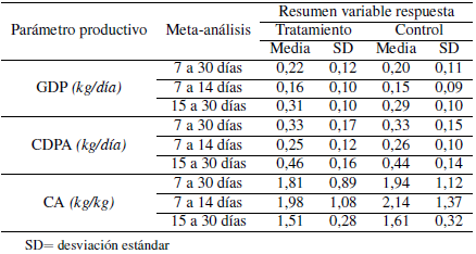 En la Tabla 1 se resumen los principales estadísticos descriptivos calculados (covariables) a partir de los 13 artículos de investigación utilizados. Las variables respuesta GDP, CDPA y CA en cada uno de los periodos evaluados se presentan en la Tabla 2.