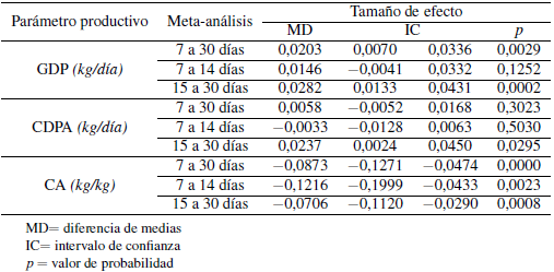 Finalmente se determinó que el número de repeticiones influye sobre la GDP para los periodos 7 a 30 (p<0,001) y 7 a 14 días (p<0,001), así como en el CDPA cuando la suplementación duró entre 15 a 30 días (p=0,024). El número de repeticiones en los distintos trabajos utilizados para este estudio van desde 2 hasta 12, siendo 3 el más utilizado. Lo anterior confirma la importancia señalada por Aaron y Hays (2004) de considerar un número apropiado de individuos para ser usados en estudios experimentales en cerdos, pues ante un número inadecuado de repeticiones por tratamiento es posible que no se lleguen a detectar diferencias significativas, generando pérdida de tiempo y dinero para el investigador.