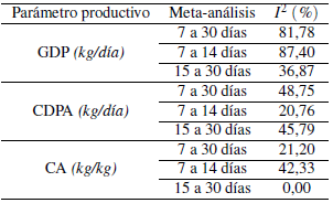 El tamaño medio del efecto (expresado en diferencia de medias) de la suplementación de Gln en lechones sobre el rendimiento productivo se presentan en la Tabla 3. Los resultados del índice de inconsistencia, y la prueba de heterogeneidad entre estudios se muestran en la Tabla 4.