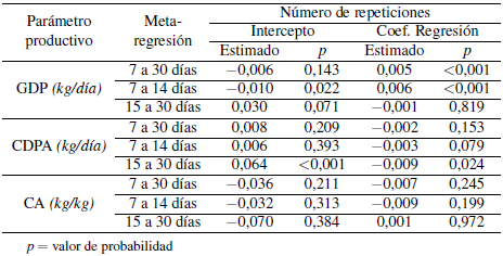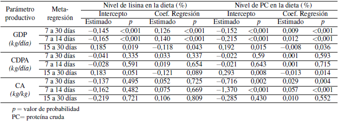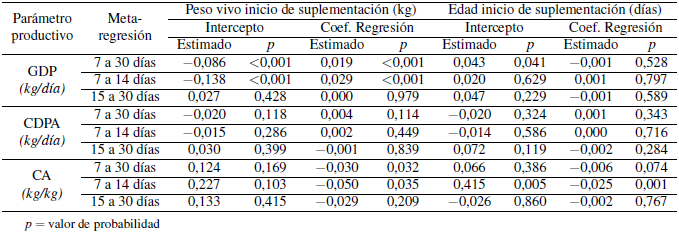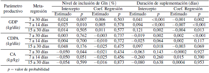 Los resultados de las meta-regresiones para determinar la influencia de cada una de las covariables sobre las variables productivas de interés en cada periodo se presentan en la Tabla 5 (nivel de inclusión de Gln y duración de suplementación); Tabla 6 (peso vivo y edad al inicio de la suplementación); Tabla 7 (nivel de lisina y proteína cruda en la dieta) y Tabla 8 (número de repeticiones).