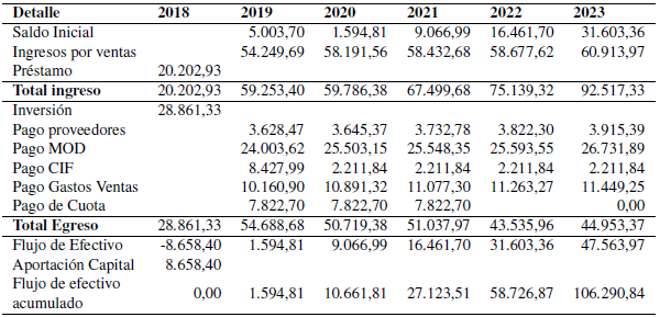 Con los ingresos y costos de producción proyectados se calculó el valor actual neto (VAN), la tasa interna de retorno (TIR) y el índice de beneficio-costo (B/C). Se ha determinado una tasa de descuento del 15,40% tomando en cuenta que hay financiamiento y riesgos de mercado por ser un proyecto nuevo. Por lo tanto, la prima al riesgo se ha estimado en 25% y una inflación promedio de los últimos años del 2,40% anual. El VAN obtenido fue de USD 31.101,62 con una TIR del 40% y un B/C de 1,26, por lo que económica y financieramente el proyecto se consideró viable (Tabla 6). Este índice indica que por cada dólar invertido se obtiene USD 0,26 de ganancia neta.
