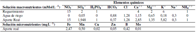 La oxigenación de la solución nutritiva se realizó diariamente durante 30 minutos dos veces al día (mañana y tarde), con el fin de proporcionar el oxígeno suficiente para las raíces y facilitar la absorción de nutrientes necesarios para el crecimiento y desarrollo de la planta. Esta labor se realizó automáticamente mediante un programador de riego y las tuberías alimentadoras ubicadas en la cabecera de cada unidad experimental. El consumo de agua, principalmente debido a la transpiración, determinó el momento de reposición de la solución nutritiva. Este consumo se determinó midiendo diariamente la altura de la lámina de agua de cada cama (unidad experimental o réplica de 1 m2). Luego se promedió el consumo de cada repetición durante todo el ciclo de cultivo y se proyectó a un consumo por planta.