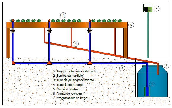 El trabajo de investigación se efectuó en un invernadero de fierro galvanizado de 20 m de largo, 10 m de ancho y 4 m de altura, con una cubierta del techo de polietileno UV/IR calibre 6, paredes laterales y frontales cubiertas con zarán blanco de 50% sombreo. La producción obtenida y los costos se proyectaron para una superficie productiva equivalente a 1.000 m2. La cama de cultivo, a 90 cm de altura, tuvo un ancho de 1 m, una altura de 10cm, de la cual 8 cm se ocupan con agua y 2 cm corresponden al grosor de la plancha de espumaflex que sostuvieron las plantas. El largo del cajón fue de 3 m y estuvo recubierto con polietileno negro de 0,2 mm de espesor en el cual el sistema de raíz flotante mantuvo las raíces de las plantas sumergidas en agua con minerales disueltos según la formulación Hoagland y Arnon (Beltrano y Gimenez, 2015). En el caso de cultivos de hoja de corta duración como la lechuga, la solución fertilizante cubre los requerimientos diarios de la planta y no es necesario modificarla. En ensayos previos se determinó ésta como la mejor formulación entre tres evaluadas. A este requerimiento se le restaron los aportes iónicos del agua de riego (agua potable), dando como resultado las dosis indicadas en la Tabla 1. El cultivo fue abastecido desde un tanque abonador (capacidad 500 litros) con un sistema de tuberías de recirculación con la solución fertilizante mediante una bomba sumergible Pedrollo Top II de 0,5 HP (Figura 1).