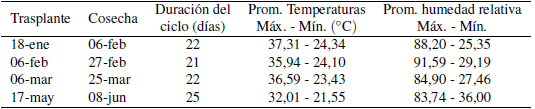 La duración de trasplante a cosecha en las distintas fechas de establecimiento de cultivo varió entre 21 y 25 días (Tabla 2), el período más largo correspondió a la época con menores temperaturas (verano de Ecuador). Esto permitió proyectar 12 cosechas anuales, considerando la elaboración escalonada de los almácigos o plantines, para evitar tiempos muertos. Por tanto, independiente de la época del año (invierno o verano) la duración del ciclo de cultivo es similar debido a la poca variación en las condiciones climáticas de la costa ecuatoriana. Esto a diferencia de un país con clima templado como España, donde una misma variedad tiene ciclos de cultivo entre 31 (época calurosa) y 81 días (época fría) (Sabada et al., 2007).