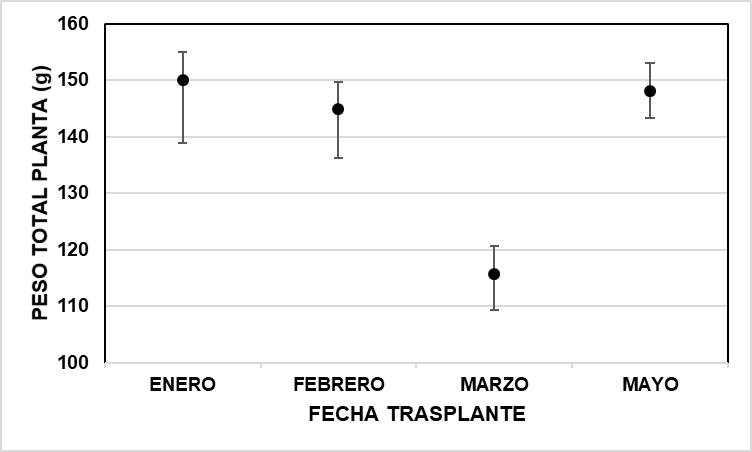 El coeficiente de variación de los datos no superó el 11,7 %, por lo que se asumió una alta confiabilidad de los pesos de planta obtenidos. Los pesos a cosecha obtenidos en los cultivos de enero, febrero y mayo fueron similares. Sólo la cosecha de marzo fue significativamente menor, alejándose de un peso comercial óptimo.