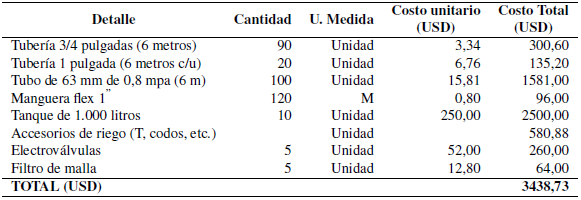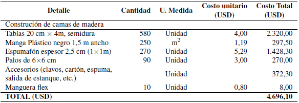 Se determinó para los 1.000 m2 de infraestructura el coste de producción unitario conformado por costes de mano de obra directa (cuatro operarios), materia prima directa (plantines, fertilizantes y agroquímicos) y los costes indirectos de fabricación (supervisor de campo, gavetas y fundas plásticas), sin considerar costos por externalización. La inversión inicial ascendió a USD 27.027,99, de los cuales el 17,00% correspondió a capital de trabajo y el restante a inversión en activos fijos. Esto constó de: a) la nave de invernadero de fierro galvanizado, la cual se estimó a precio de mercado de empresas de Quito que ofrecieron el servicio “llave en mano” a un precio de USD 10 m-2; b) la infraestructura de las camas de madera con altura de 90 cm (Tabla 3); c) el sistema de riego (tuberías de input y recirculación, programador y su instalación) (Tabla 4); d) otros adicionales como bomba de riego, gavetas, balanza y fundas plásticas.