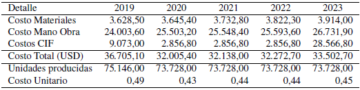Bajo estas condiciones el costo por unidad producida ascendió a USD $0,49 (Tabla 5). Las unidades a producir para el segundo año disminuyeron por el inventario que se ha considerado al final del primer año (2019). El coste unitario de producción disminuyó en este segundo año debido a que el costo de instalación del equipo de programación de riego únicamente aplica para el primer año.