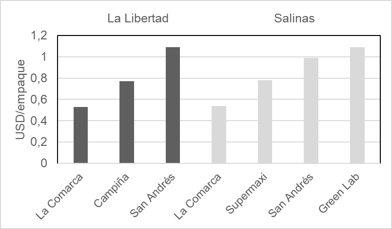 El precio pagado al productor de lechuga hidropónica en el mercado nacional (cadenas de supermercados) es aproximadamente USD 0,50. El precio de venta final en las mismas cadenas está alrededor de USD 1,00 por funda en base a un sondeo realizado a supermercados de la provincia de Santa Elena (Figura 3). El costo unitario obtenido sólo sería sustentable con una venta directa al consumidor, sin intermediarios. De acuerdo a la misma encuesta, las ventas semanales de dichos supermercados ascienden en la provincia de Santa Elena a 2.000 unidades aproximadamente. Las ventas semanales del presente supuesto (1.418) correspondería al 70% de dicho valor, superando la capacidad de absorción del mercado local. Se asume una comercialización del producto en provincias aledañas como Guayas, Manabí y Los Ríos. Actualmente el mercado está copado por producción de las provincias de la sierra ecuatoriana, principalmente tres empresas, pero según el principal actor del rubro hay mucho espacio para crecer (datos propios).