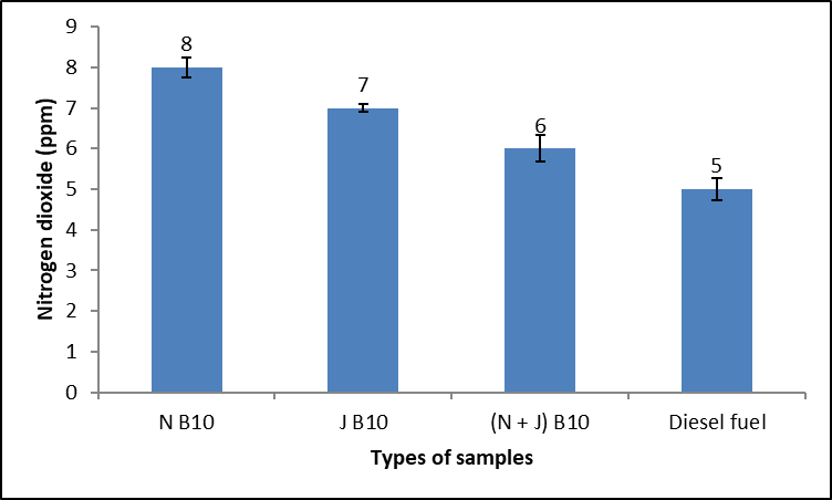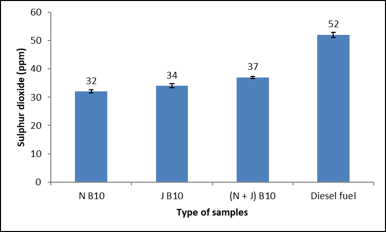 La Figura 5 muestra las emisiones de dióxido de nitrógeno (NOx) de la combustión de diferentes muestras de combustible mezclado. Se observó que las emisiones de NOx fueron mayores con respecto a las muestras de combustible mezclado con biodiésel, en comparación con el diésel mineral (es decir, 37,5% de NB10 y 28,57% de JB10, respectivamente). También en otras investigaciones se observó un aumento del 20% en las emisiones de NOx de neem B10 en comparación con el combustible diésel (Kumar, Kaviti y Darum, 2017). La temperatura más alta es el resultado de la combustión de biodiésel, que produce NOx con una reacción entre el exceso de contenido de oxígeno presente en las emisiones de combustible mezclado con biodiésel y nitrógeno atmosférico. Las emisiones de dióxido de azufre (SOx) se presentan en la Figura 6, y los resultados mostraron una reducción de las emisiones de SOx en más del 38,46% de NB10 y del 34,61% de JB10, respectivamente, en comparación con el diésel mineral. Resulta ventajoso utilizar combustible mezclado con biodiésel con bajo contenido de azufre para reducir la contaminación del aire que conlleva al calentamiento global y los problemas de lluvia ácida.