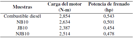 La variación de la potencia del freno en las diferentes muestras de combustible mezclado (diésel mineral, NB10, JB10 y NJB10) a una velocidad constante del motor de 1000 rpm se presenta en la Tabla 4. Los resultados mostraron menor potencia generada a partir del combustible biodiésel mezclado en comparación con el diésel de petróleo debido a su menor valor calorífico (38 a 39 MJ/kg) y en comparación con el diésel mineral (42MJ/kg), información que también se menciona en la literatura (Chakrabarti y Ali, 2008). Además, se observó que la carga del motor y la potencia generadas por el biodiésel Neem NB10 fueron mayores en comparación con el biodiésel JB10 de Jatropha, debido al mayor valor calorífico del biodiésel de Neem (39,67 MJ/kg) en contraste con el biodiésel de Jatropha (38,96 MJ/kg). La combustión del diésel mineral produjo una carga más alta durante las pruebas del motor en comparación con las diferentes mezclas de biodiésel, debido a su mayor valor calorífico (42 MJ/kg) (Chakrabarti y Ali, 2008). Los resultados indicaron que el B10 tiene un rendimiento más cercano del motor al diésel mineral debido a su viscosidad cinemática en comparación con el diésel mineral (Chakrabarti y Ali, 2009). La potencia generada por el biodiésel de Neem NB10, Jatropha JB10 y el biodiésel mixto Neem / Jatropha NJB 10 fueron de 7,7%, un 16,4% y un 12%, respectivamente, menor que el diésel mineral.