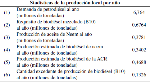 La demanda total de diésel de alta velocidad en el país por año es de 6.674 millones de toneladas (Dawn, 2019) y si se utiliza biodiésel mezclado (B10) en el país, la cantidad requerida será de 0,6764 millones de toneladas al año para cumplir con el requisito AEDB de utilizar biodiésel mezclado B10. Para satisfacer la cantidad requerida de biodiésel, la diferencia entre la columna (2) menos las cantidades estimadas de biodiésel de Neem (columna 4) y el biodiésel de aceite de cocina residual (columna 5) da una cantidad mayor de producción de biodiésel (0,1326 millones de toneladas) en el país al año, sin competir con los cultivos comestibles de aceite.