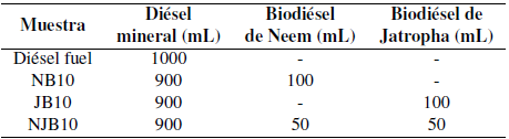 Las muestras de combustible (1 L =1000 ml) se prepararon mezclando el biodiésel producido con el diésel convencional adquirido de la estación de combustible operada por la empresa de Pakistan State Oil (PSO) en las siguientes proporciones, como se muestra en la Tabla 1 y según el requisito de AEDB para mezclar el diésel convencional con el 10% de combustible de biodiésel.