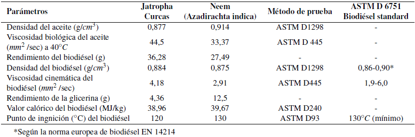 Las propiedades del biodiésel de Jatropha curcas y Neem se determinaron siguiendo las normas y procedimientos ASTM que se presentan en la Tabla 3 y luego se compararon con la norma internacional de biodiésel (ASTM D 6751). Se observó que la viscosidad cinemática del biodiésel de Neem estuvo más baja, es decir, 2,91 mm2/seg en comparación con el biodiésel de Jatropha curcas 4,18 mm2/seg. La viscosidad cinemática reducida es buena en términos de calidad del combustible biodiésel, pero el rendimiento del biodiésel de Neem fue un 24,33%, menor en comparación con el rendimiento del biodiésel de Jatropha.