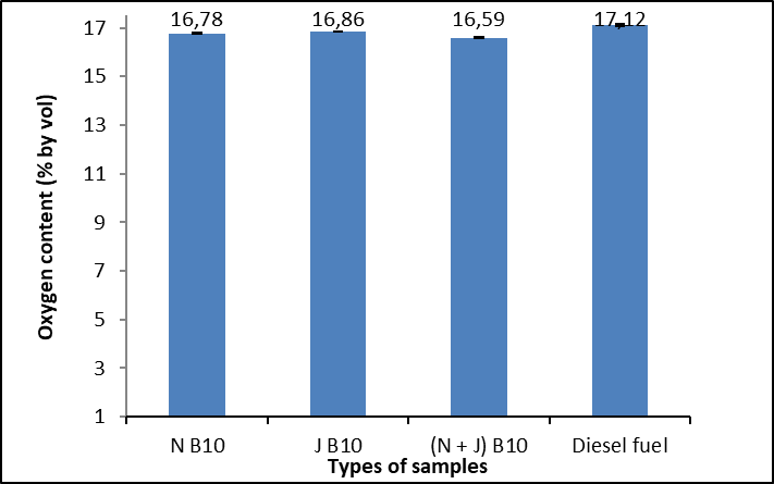 Se trazó el perfil de emisiones de gases de diferentes mezclas de combustible biodiésel para comparar la diferencia entre sus características de emisión. La Figura 1 muestra el porcentaje de contenido de oxígeno presente en las emisiones de gases de escape y se observó que el diésel mineral (17,12 ± 0,05%) presenta más contenido de oxígeno en comparación con las muestras de combustible mezclado con biodiésel. La posible razón podría ser debido a la alta temperatura y al alto contenido de oxígeno presente en el combustible biodiésel, y que el exceso de oxígeno presente en el biodiésel se utilizó en la producción de óxidos de nitrógeno (NOx). Generalmente el exceso de oxígeno no reacciona con nitrógeno en el cilindro del motor, pero reacciona con nitrógeno atmosférico a altas temperaturas de escape (Kumar, Kaviti y Darum, 2017).