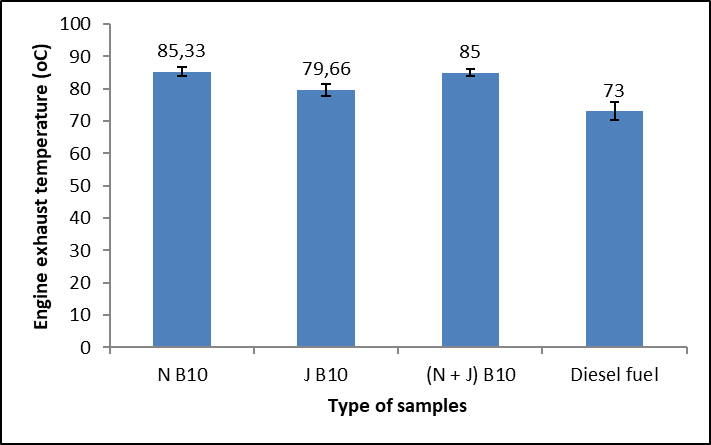 Del mismo modo, el perfil de temperatura de escape del gas de combustión del motor diésel que funciona en diferentes mezclas de combustible (Figura 2) mostró que se obtuvieron temperaturas más altas a partir de la combustión del combustible de la mezcla de biodiésel en comparación con el combustible diésel. Esto se debe a la presencia de propiedades oxigenadas del biodiésel con la combustión completa, lo que resulta en temperaturas de escape más altas (es decir, 14% y 8,75% de combustibles de biodiésel mezclados de neem y jatropoha superiores al diésel mineral). Un estudio previo sobre biodiésel de palma mostró una temperatura de gases de escape 5,6% mayor que el diésel de petróleo. La mejor característica de combustión del biodiésel con mayor temperatura del cilindro se debe al efecto del exceso del contenido de oxígeno presente en su composición (Arunkumar et al., 2018).