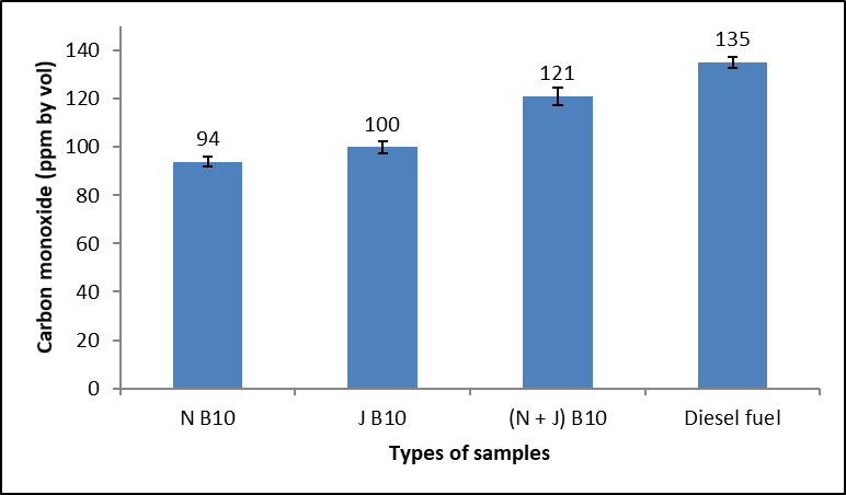 La Figura 3 muestra la emisión de monóxido de carbono (CO) de diferentes muestras de combustible, mostrando menos emisiones de CO de combustibles mezclados con biodiésel (tales como NB10= 94 ± 2.15, JB10= 100 ± 2.44 and NJB10=121 ± 3.65 ppm) en comparación con el diésel mineral (135 ± 2,18 ppm). De acuerdo a lo observado en la literatura, la razón principal de las mayores emisiones de CO de la combustión de diésel mineral se debe a su combustión incompleta (Kumar, Kaviti y Darum, 2017). Por lo tanto, la presencia de un mayor porcentaje de oxígeno en el biodiésel conduce a un proceso de combustión más completo, lo que resulta en menores emisiones de CO (Dincer, 2008).