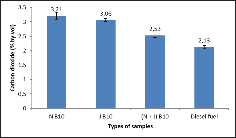 Los resultados actuales de las emisiones de dióxido de carbono (CO2) se encontraron más altos en las muestras de combustible mezclado con biodiésel en comparación con el combustible diésel mineral (Figura 4). El biodiésel de Neem NB10 mostró mayores emisiones de CO2 en contraste con el biodiésel JB10 de Jatropha. Las emisiones de CO se redujeron para la mezcla de biodiésel de Neem (NB10) en un volumen del 30,37 % en comparación con el diésel mineral. El valor de emisión de CO se encontró cerca con una reducción media para Neem B10 en un volumen del 26%, como se menciona en la literatura (Kumar, Kaviti y Darum, 2017).