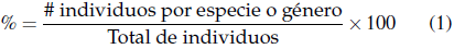 Los botones florales y frutos fueron observados bajo un estereoscopio con un aumento de 10 a 100 X, contando el número de individuos por cada órgano, que fueron colocados en una cápsula Petri que contenía alcohol etílico al 75%, utilizando para esto un pincel fino. Los especímenes colectados en flores en el campo, fueron colocados en capsulas Petri para su conteo. A partir de allí, los especímenes fueron separados hasta el nivel de género o especie. Para esto, previamente, los individuos fueron colocados en KOH por dos horas para decolorarlos y así observar mejor las estructuras del cuerpo del insecto; se continuó con tres lavados con agua destilada y finalmente se colocó glicerina y se procedió a montarlos en portaobjetos usando solución Hoyer como medio (Anderson, 1954). Las placas fueron colocadas en la estufa para secado 50°C por 24 horas para luego sellar los bordes del cubre objeto con esmalte transparente. Para la identificación de las especies de trips se utilizó la clave taxonómica de Moritz et al. (2004). A partir de los conteos, se calculó el porcentaje de abundancia utilizando la Ecuación 1.