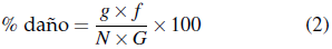 La intensidad de los daños fue estimada semanalmente sobre diez frutos, fisiológicamente maduros, utilizando una escala visual arbitraria, asignándole grados en función de las deformaciones o cicatrices en el pericarpio respecto al área del fruto: grado 0: sin daño, grado 1: 1 al 5% de daño, grado 2: 6 a 25%, grado 3: 26 a 50%, grado 4: 51 a 75%, grado 5: 76 a 100%. Se contó el número de frutos en cada escala, con lo que se calculó el porcentaje de daño, utilizando la siguiente Ecuación 2 referida por Rivas et al. (2017). Dónde g representa la escala de daño, f el número de frutos en la escala, N es el número de frutos evaluados y G es la escala máxima establecida.