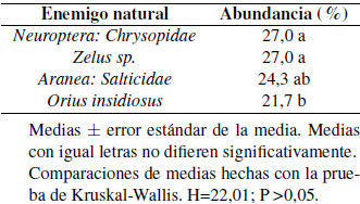Fueron detectados cuatro taxones de enemigos naturales: una especie de crisópido (Neuroptera: Chrysopidae) no determinada, Zelus sp. (Hemiptera: Reduviidae), Orius insidiosus (Say) (Hemiptera: Anthocoridae) y una especie de araña (Aranae: Salticidae) no identificada (Tabla 3). La abundancia de estos enemigos naturales difirió significativamente (P<0,05). Así, el Chrysopidae y Zelus sp. fueron significativamente superiores, siendo O. insidiosus la especie menos abundante (Tabla 3).