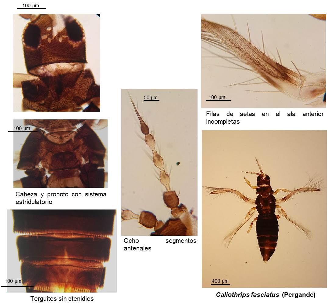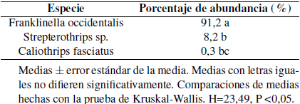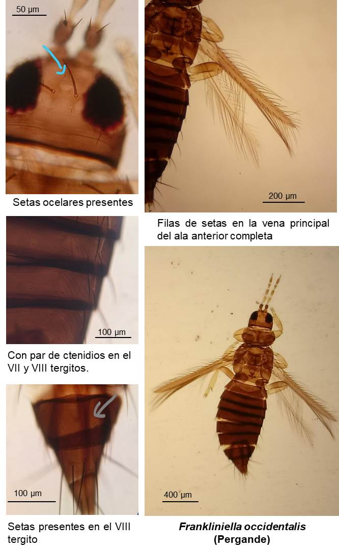 Las características correspondientes a cada una de las especies o género detectados durante este estudio, fueron resumidas en las Figuras 1 a 3. Un total de 866 especímenes fueron colectados e identificados como, el trips occidental de las flores, Frankliniella occidentalis (Pergande) (Thysanoptera: Thripidae) (Figura 1) la especie más abundante (Tabla 1), seguido del trips, Strepterothrips sp. (Thysanoptera: Phlaeothripidae) (Figura 2) y el trips del frijol, Caliothrips fasciatus (Pergande) (Thysanoptera: Thripidae) (Figura 3) como la especie menos abundante (Tabla 1), sin diferencias significativas entre las dos últimas.