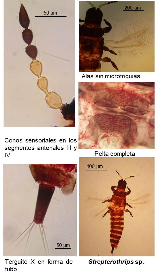 La segunda especie aquí observada pertenece al género Strepterothrips. Las especies de este género, se alimentan principalmente de hongos (Mound y Tree, 2015). Hasta ahora en Ecuador las especies de este género, Strepterothrips floridanus (Hood) y Strepterothrips sp., solo han sido reportadas para la Isla de Galápagos, (Hoddle y Mound, 2011).