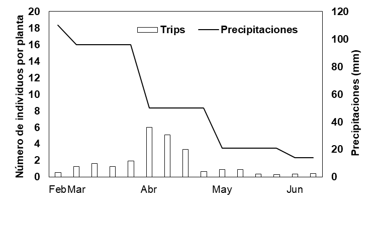 Coincidiendo con estos resultados, ha sido referido el incremento de las densidades poblacionales de varias especies de trips, asociado con la presencia de flores para otros cultivos (Urías-López et al., 2007; Palomo et al. 2015, García-Escamilla et al. 2016). Trujillo (2017) en un trabajo realizado en una plantación de mango en la región de Guerrero, México, encontró que las altas poblaciones de varias especies de Frankliniella estaban principalmente favorecidas por el estado fenológico de floración. Mujica (2018), en un estudio realizado en Uruguay en viñedos de uva blanca, detectó altas poblaciones de F. occidentalis en el momento de la floración.