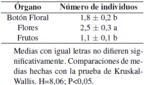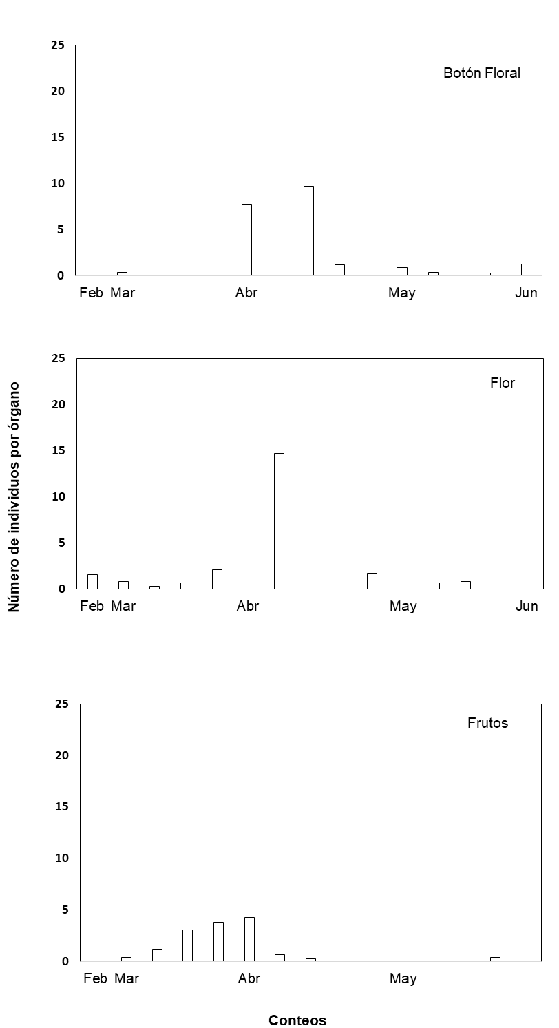 En frutos, las poblaciones fueron menores respecto a los botones florales, alcanzando valores máximos de 3 a 4 individuos en las últimas dos semanas de marzo y la primera semana de abril (Figura 5C). A pesar de esas diferencias numéricas entre botones florales y frutos, las poblaciones de trips sobre estos órganos, no difirieron significativamente (Tabla 2, P < 0,05).