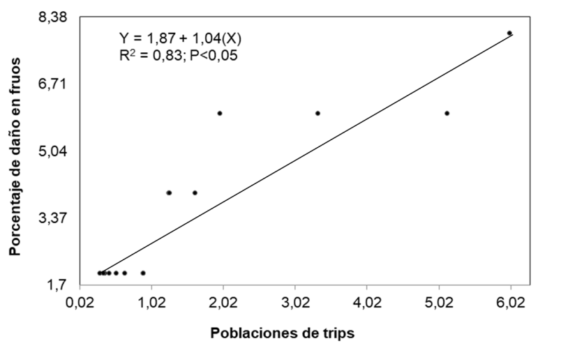 El modelo de regresión simple calculado, muestra que el incremento el porcentaje de daños sobre los frutos (Y) está en función del aumento de las poblaciones de trips (X), con un significativo (P < 0,05) y alto coeficiente de determinación (R2: 0,83) (Figura 6). La Figura 6 también muestra que los menores daños en frutos fueron aproximadamente de 2% y el máximo valor estimado estuvo alrededor del 8%. Utilizando la ecuación, se calculó que con una población de 18 trips se obtendría el 20% de daños y con 47 trips, habría un 50% de daño sobre los frutos.