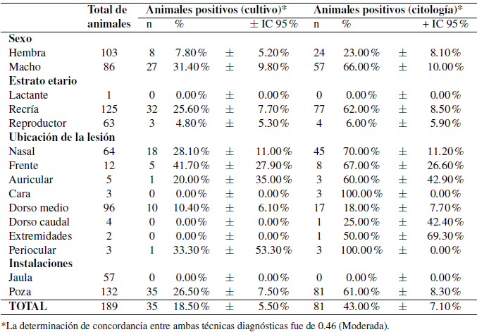 Por otro lado, la frecuencia para dermatofitosis en animales con lesiones dermatológicas diagnosticadas por el método de citopatología fue mayor frente al cultivo micológico, con índices de 43 ± 7.1% de los animales evaluados. En relación a las frecuencias de dermatofitosis por grupo etario en el presente estudio, se reporta que estas varían desde 0% en lactantes hasta 62% en recría. A nivel de regiones afectadas, la mayor frecuencia ocurre en la región nasal, frontal y auricular, con frecuencias entre 28.1% y 40.7% (Tabla 1). En cuanto al tipo de instalación, hay una frecuencia de dermatofitosis de 62% en animales criados en pozas, y un 0% en animales criados en jaulas, mostrando una mayor sensibilidad de esta técnica para el diagnóstico.