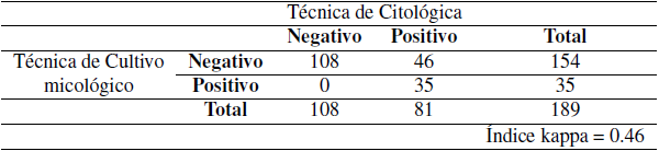 Varios factores influyen en el grado de concordancia del índice kappa para este estudio donde se enfrentan técnicas de diagnóstico como el cultivo micológico y la citológica; estos factores son grupos etarios, edad, sexo, tipo de instalaciones, grado de entrenamiento de los técnicos responsables de la toma de muestra y la ejecución de las técnicas de diagnóstico en la evaluación (Tabla 2).
