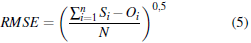 RMSE (raíz del error cuadrático medio) es un parámetro ampliamente utilizado en estudios meteorológicos y ambientales como por ejemplo de la calidad del aire o investigación climática (Willmott y Matsuura, 2005; Nayak y col., 2013; Ritter y Muñoz-Carpena, 2013; Chai y Draxler, 2014). Es una metodología cualitativa donde los errores más grandes del modelo tienen más peso que los más pequeños (Willmott y Matsuura, 2005; Chai y Draxler, 2014). De igual forma, Ferguson (2007) afirma que este parámetro es útil para estimar el rendimiento del modelo de valores altos, y tiene las mismas unidades que la variable bajo estudio. Este parámetro es sensible a los valores atípicos, por lo que es importante eliminar los valores altos observados en la muestra (Chai y Draxler, 2014). La ecuación de RMSE se observa en la ecuación 5. Donde S significa valores simulados, O significa datos observados, y N es el número de datos. Un modelo de ajuste perfecto tendrá un valor de RMSE de 0.