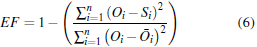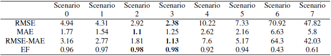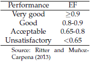 Cuando se analiza la ecuación 6, el numerador representa la variación inexplicable de los datos por el modelo, mientras que el denominador es la diferencia de los datos observados con respecto a la media (McCuen, Knight y Cutter, 2006). Ritter y Muñoz-Carpena (2013) otorgan a la Tabla 2 una gama de valores para EF y sus implicaciones para el rendimiento del modelo. Un EF de 1 significa que el modelo y los datos medidos encajan perfectamente; donde